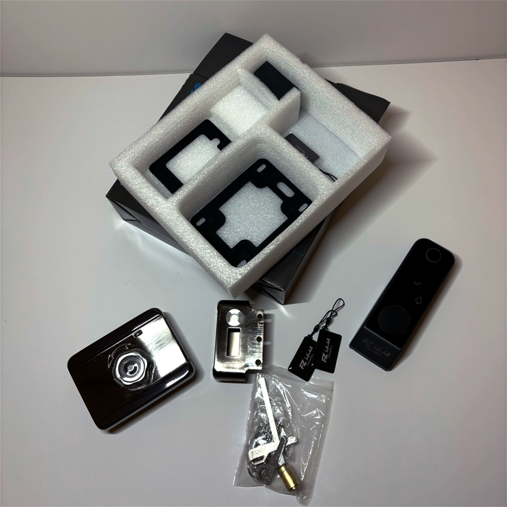 المحتويات: القفل وملحقاته الرئيسية (جهاز البصمة, براغي التركيب, مفاتيح يدوية) - بطاقتين ممغنطة - دليل المستخدم باللغة الإنجليزية.